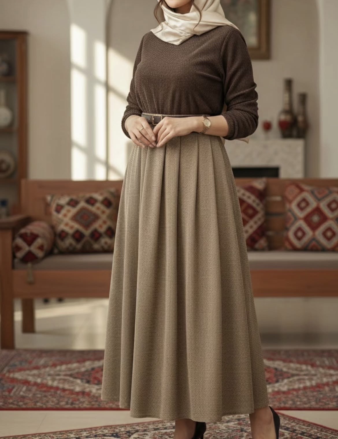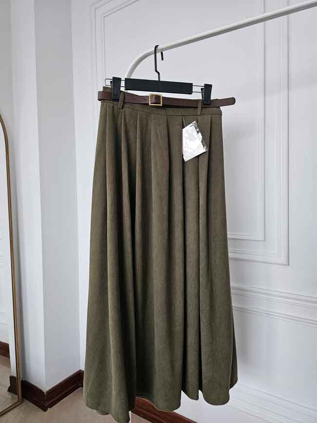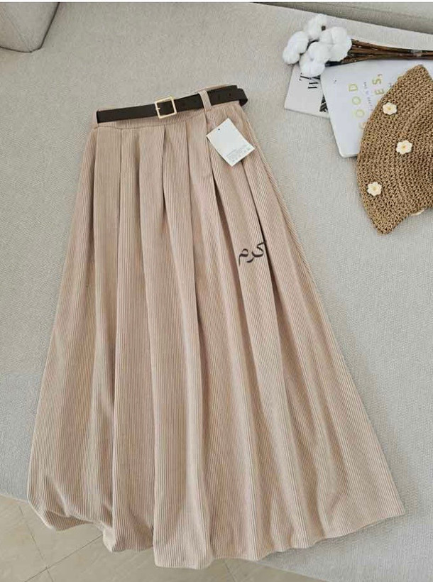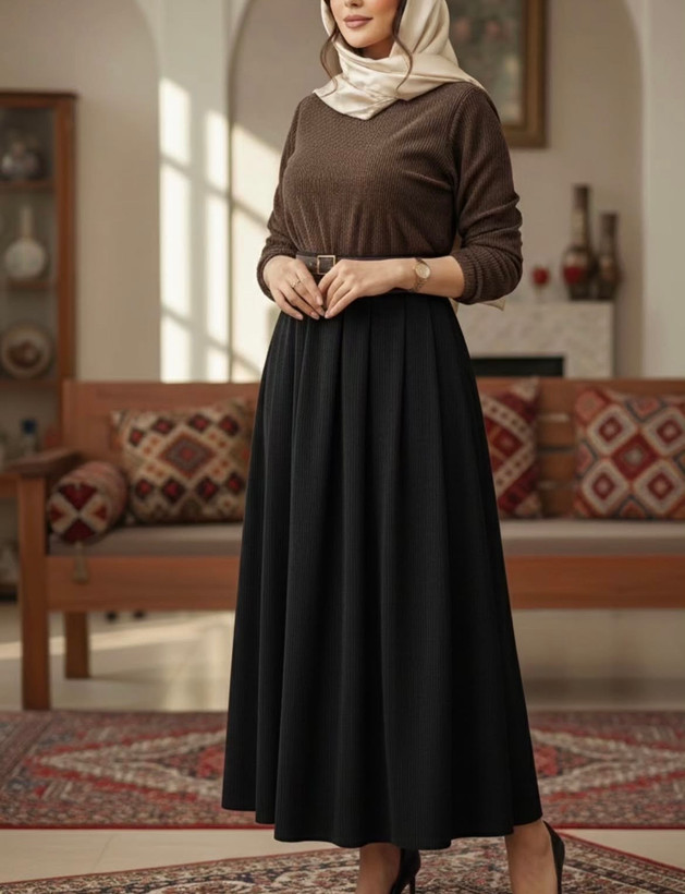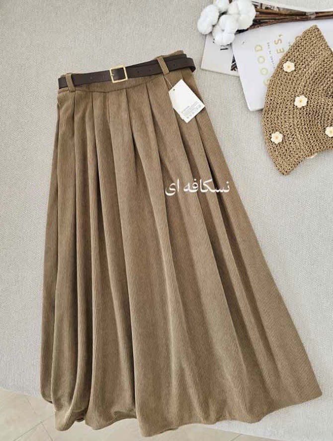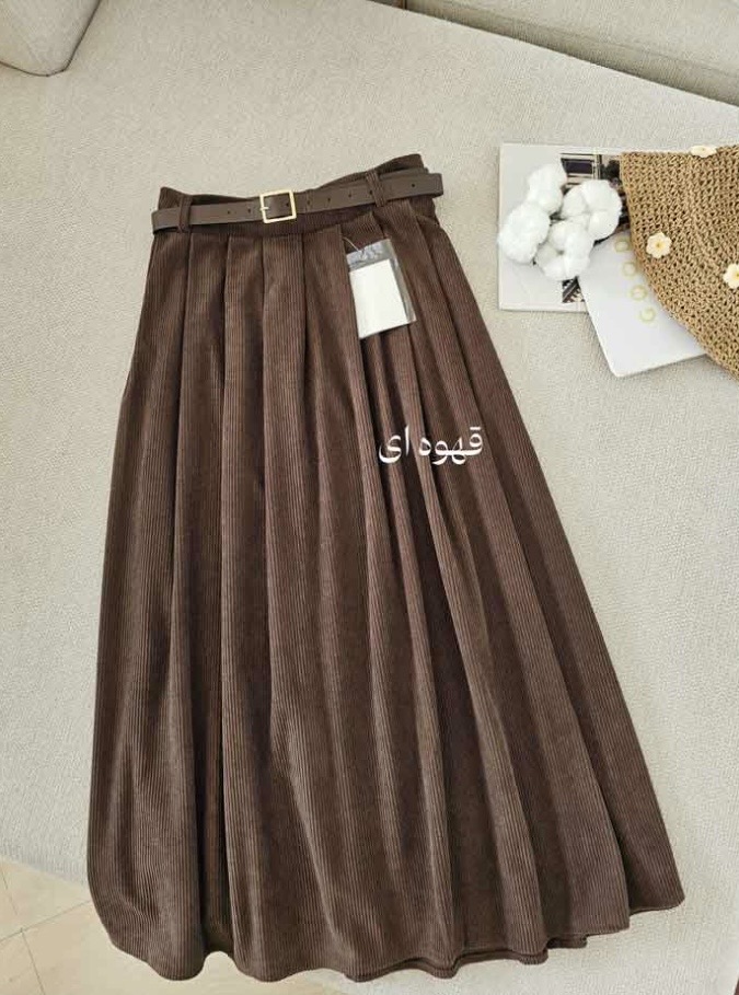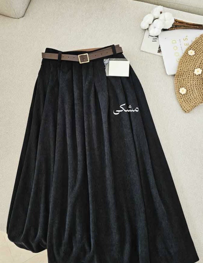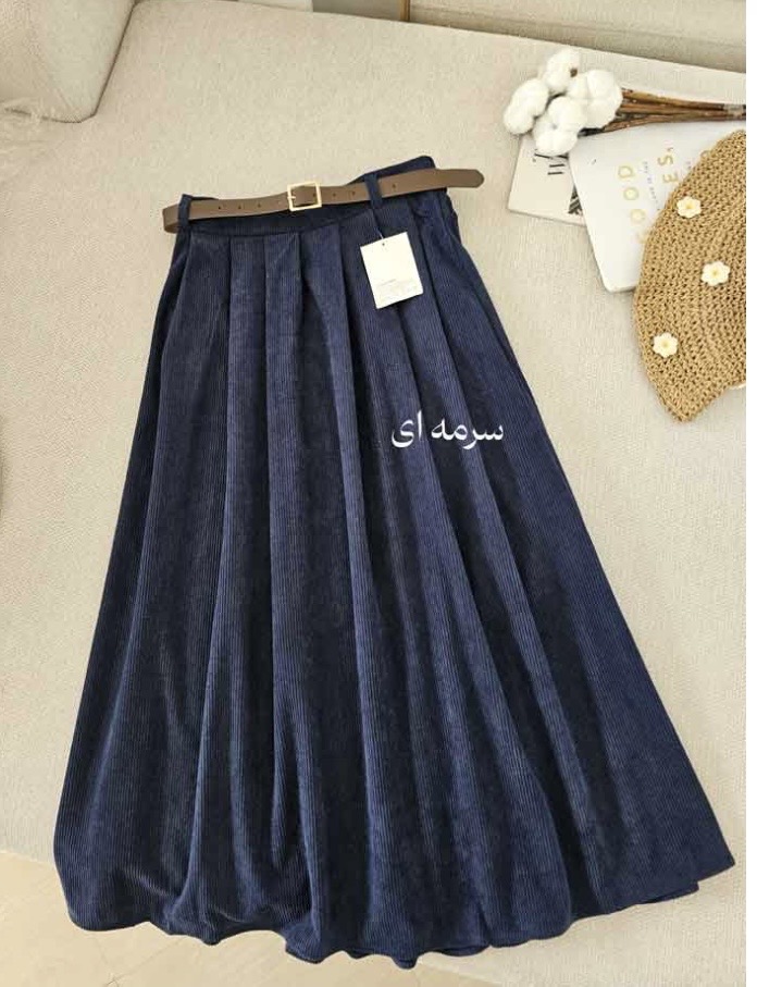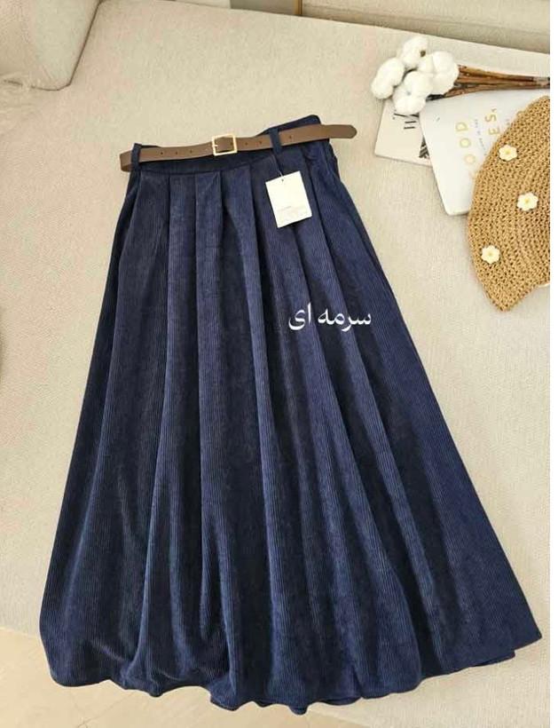 جنس: مخمل کبریتی وارداتی بسیار با کیفیت و لطیف و ریزش دار ، به همراه کمربند چرم ، بغل دامن دارای رسد مخفی، پشت کمر کش کارشده است