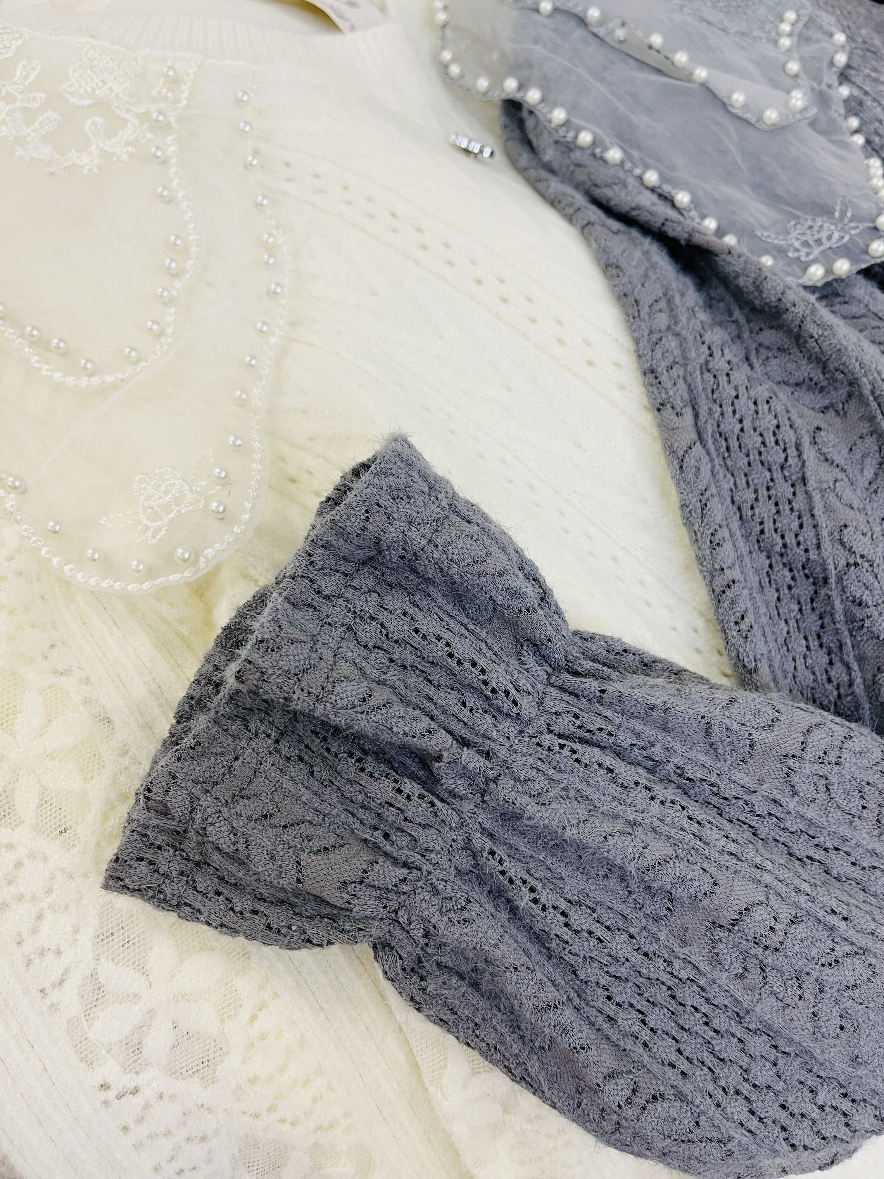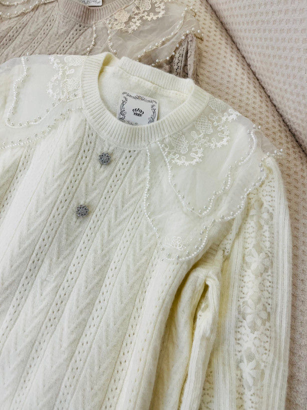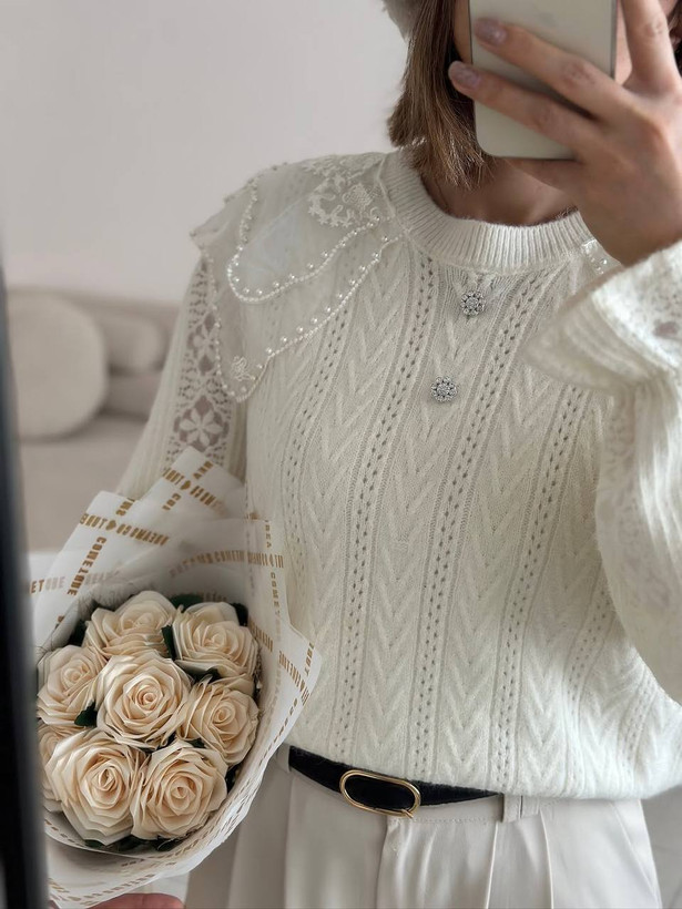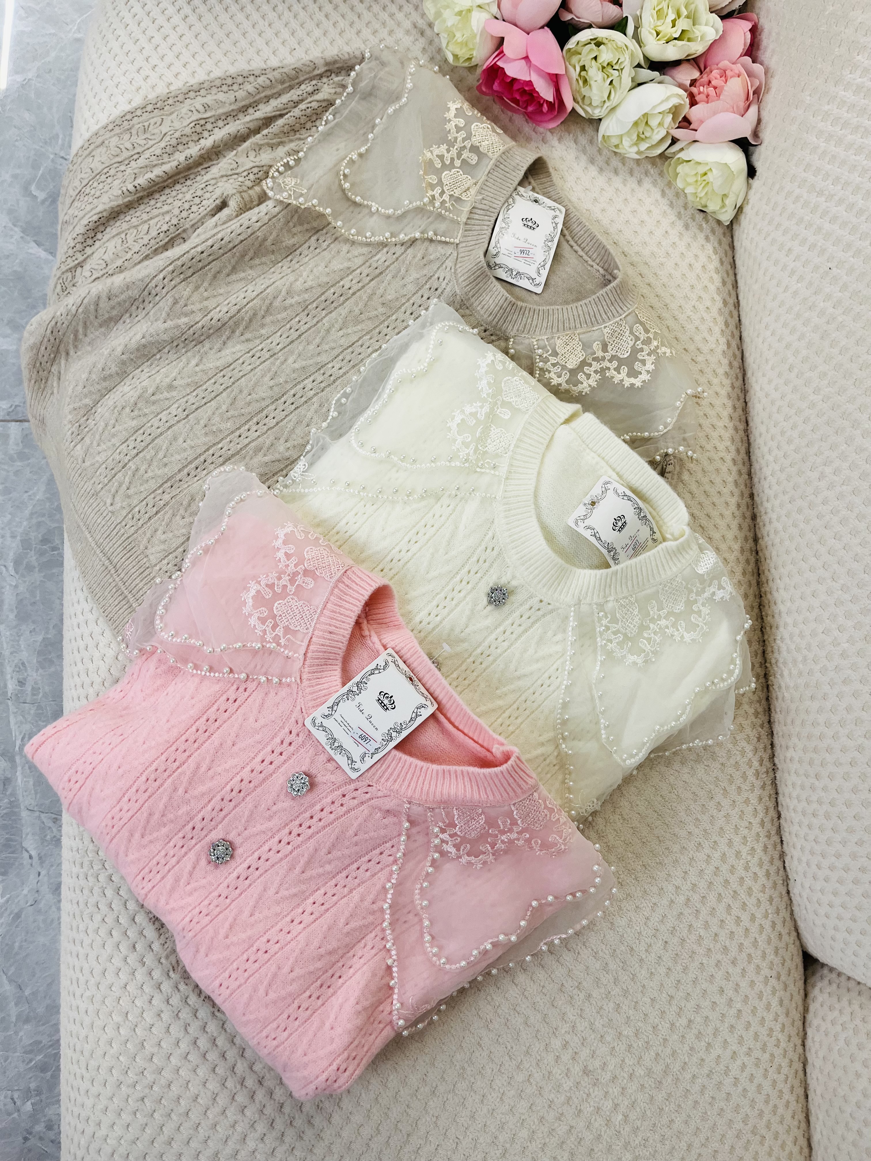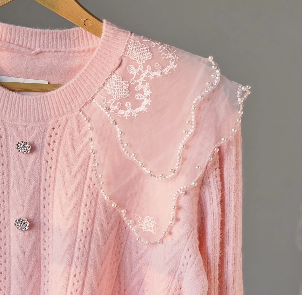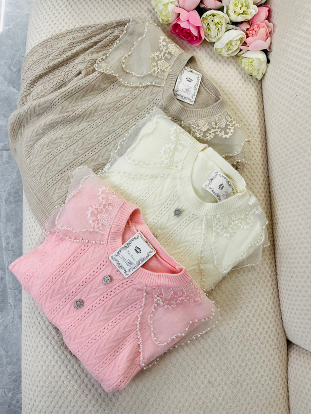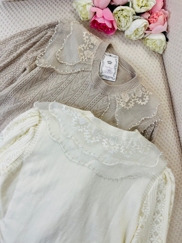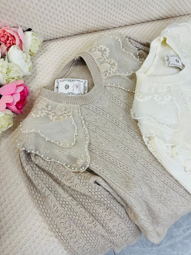 با دولایه حریر شیشه ای که روی یقه کار شده و روی اونم مروارید های زیبایی پانچ شده ، زیبایی کارو چند برابر کرده