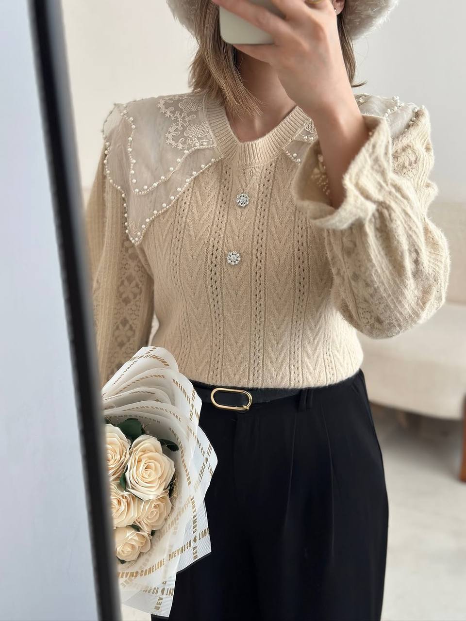 بدنه شونیز بافت لطیف وارداتی هست و آستین ها موهر بسیار لطیف ، مچش کش خورده