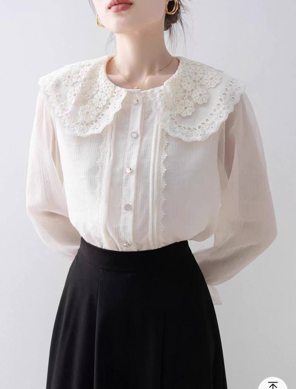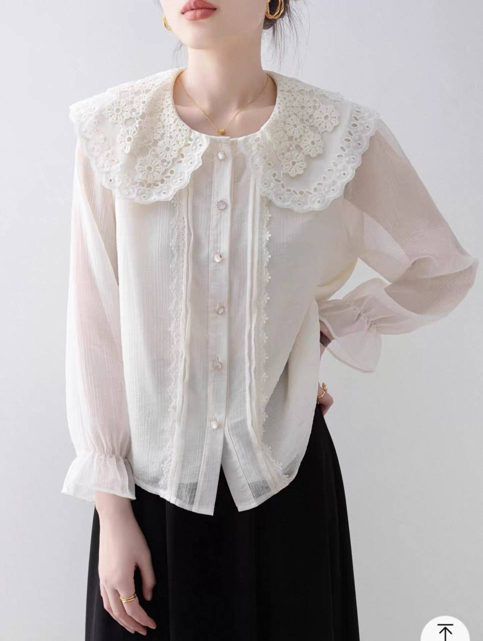 شومیزی از جنس حریر شیشه ای و وارداتی و آستری دار که پوشیده ست و دکمه های جلوش باز میشه ، جزییات بسیار زیبایی داره